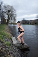 - DescriptionVrouw in badpak komt uit het water. De vrouw heeft gezwommen in open water en heeft een zwarte badmuts op, zwarte handschoenen en zwarte schoenen aan.